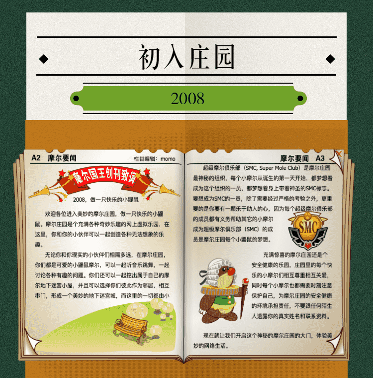 在这一年,,,摩尔庄园诞生了。。。在这里,,,,大家都是可爱的红鼻子鼹鼠小摩尔,,可以一起勤劳耕作,,,,一起高山滑雪......我们都是摩尔庄园的建设者。。