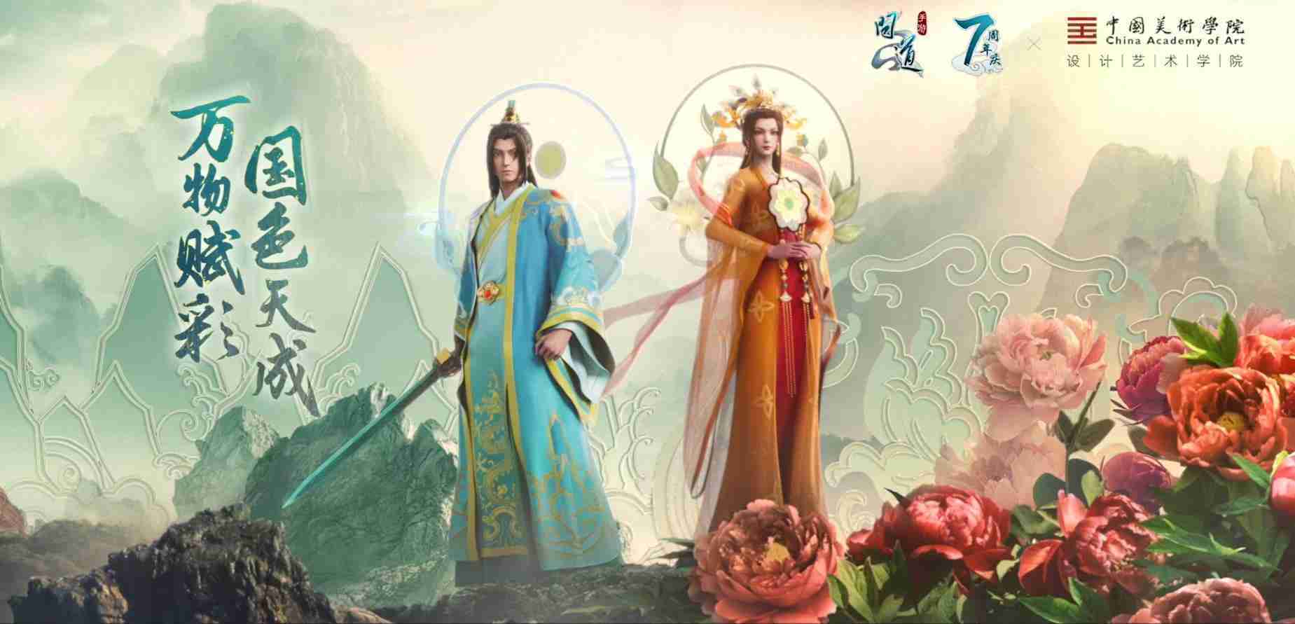2023年4月,,,,《问道手游》联动中国美术学院,,在游戏中融合了中国历史上不同时期的文化元素,,,,打造了“山河万象”与“凤鸣九霄”的国风时装。。。在色彩配置方面,,创作团队基于对游戏角色特性的分析提取相应的文化内涵,,,,从每一种色彩的色相、、、指代事物和情感出发对应角色属性,,,,选定服装的色彩搭配。。。在纹样设计方面,,,,创作团队结合游戏角色自身特殊的造型比例和形态,,在实际的纹样设计中进行了游戏语境下的活化演绎。。男性角色集中使用了如蟒纹、、、、海水江崖纹、、、如意纹和云气纹等传统纹样元素,,,女性角色则吸纳了凤凰纹、、、牡丹纹、、卷草缠枝纹等元素,,组成以“双凤牡丹纹样”“缠枝牡丹纹”“金玉凤冠头饰”为主要纹样的游戏角色装饰图案系统。。。