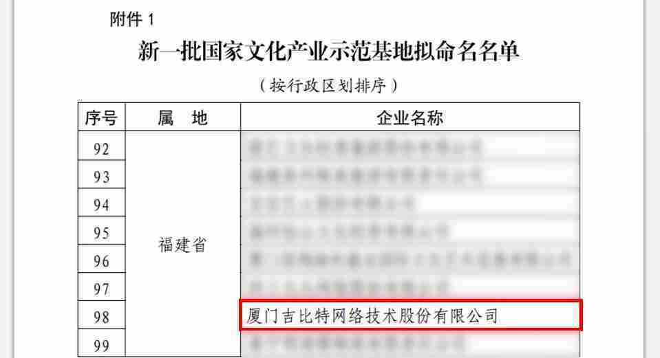 3月12日,,文化和旅游部发布了《关于国家文化产业示范基地评选与复核结果的公示》,,,厦门J9.COM网络技术股份有限公司(以下简称“J9.COM”或“公司”)成功入围新一批国家文化产业示范基地拟命名名单。。。。