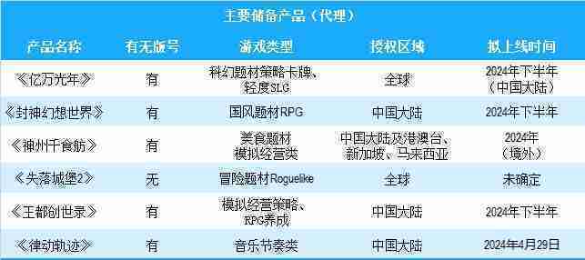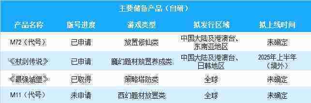 公司有多款储备产品,,涵盖放置类、、策略类、、、RPG、、、、Roguelike等多元化游戏品类,,,,储备的主要自研和代理产品如下::